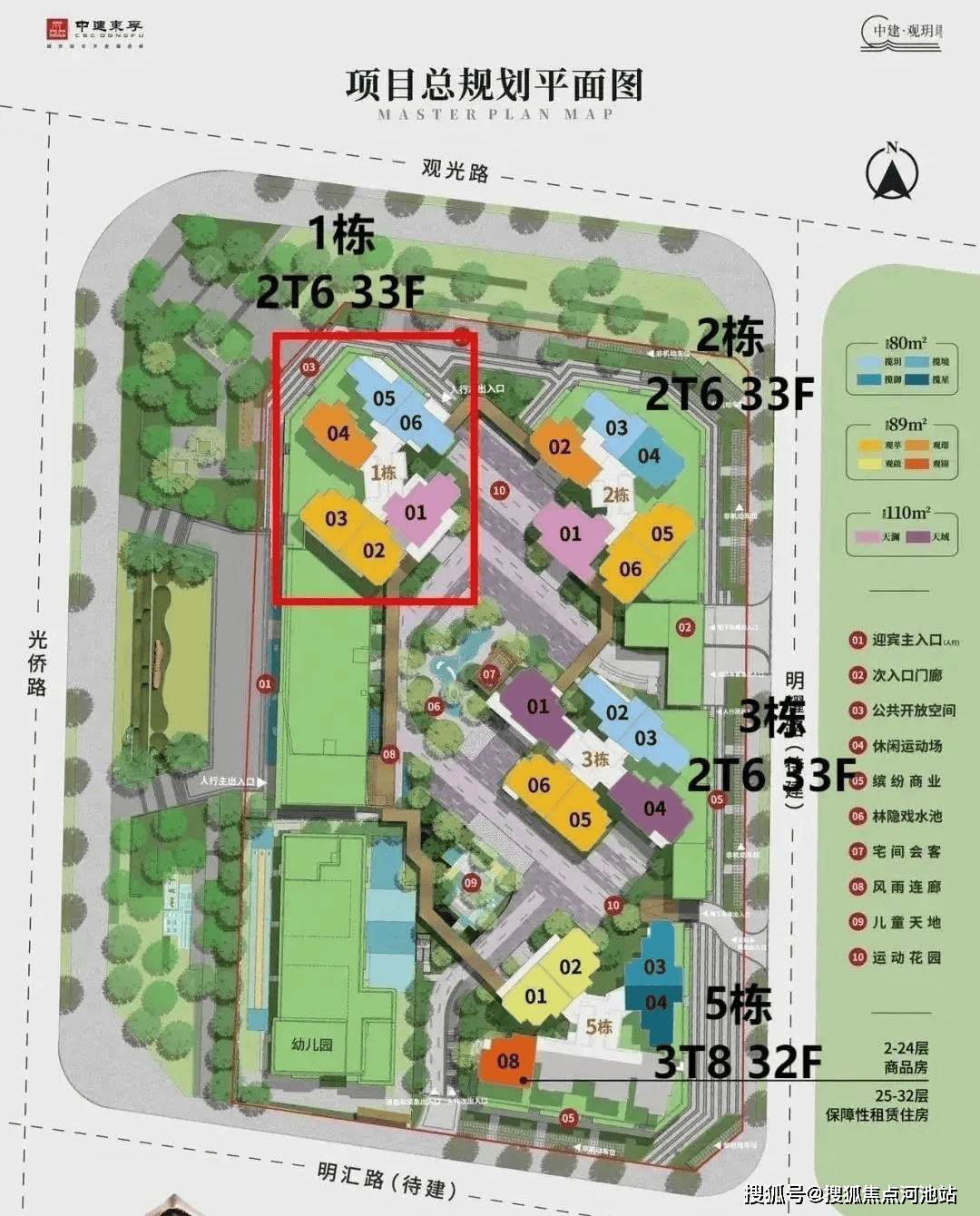 规划:中建观玥项目总占地约 1.43 万㎡,总建筑面积约 7.91 万㎡,容积率为 5.4,由 4 栋总高 32-33 层的住宅组成,共计 820 套房源,均为 80-110㎡3-4 房户型,配备 898 个停车位,车位比达 1:1.1。