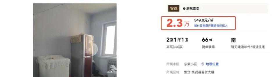 在安居客平台,目前双鸭山总价最便宜的一套二手房是长虹小区一套一室一厅毛坯房,总价2万元,单价1000元/平方米,月供64块钱;单价最低的则是东荣小区的349元/平方米66平方米两室一厅,总价2.3万元,月供73块钱。从安居客显示的房源情况看,10万元以内能拿下的两室一厅不在少数。